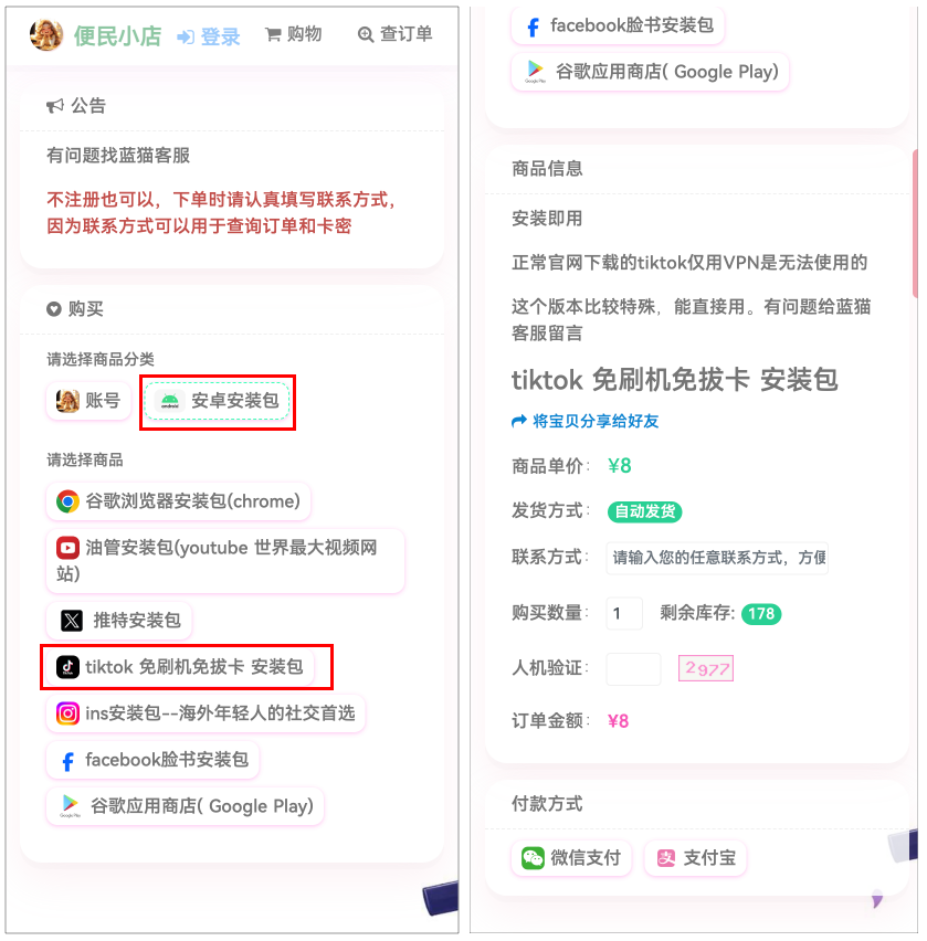1.选择安装安装包 2.选择Tiktok 免拔卡安装包 3.输入联系方式,验证码 4.选择微信或者支付宝付款。